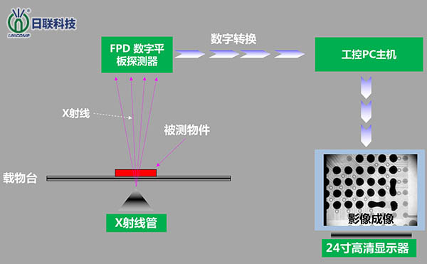 當板子沿著導軌進入機器內(nèi)部后,位于板子上方有一X-ray發(fā)射管,其發(fā)射的X射線穿過板子被置于下方的探測器(一般為攝像機)所接受,由于焊點中含有可以大量吸收X射線的鉛,因此與穿過玻璃纖維銅、硅等其他材料的X射線相比,照射在焊點上的X射線被大量吸收,而呈現(xiàn)黑點產(chǎn)生良好的圖像,使得對焊點的分析變得相當簡單直觀,故簡單的圖像分析算法便可自動且可靠地檢驗焊點的缺陷。