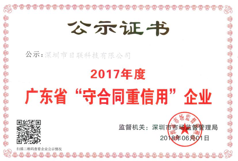 近日,廣東省工商行政管理局發(fā)布關于2017年度 “廣東省守合同重信用企業(yè)”的公告,日聯科技憑借十多年來的積累與信譽,再度榮獲“守合同重信用企業(yè)”這一榮譽稱號。