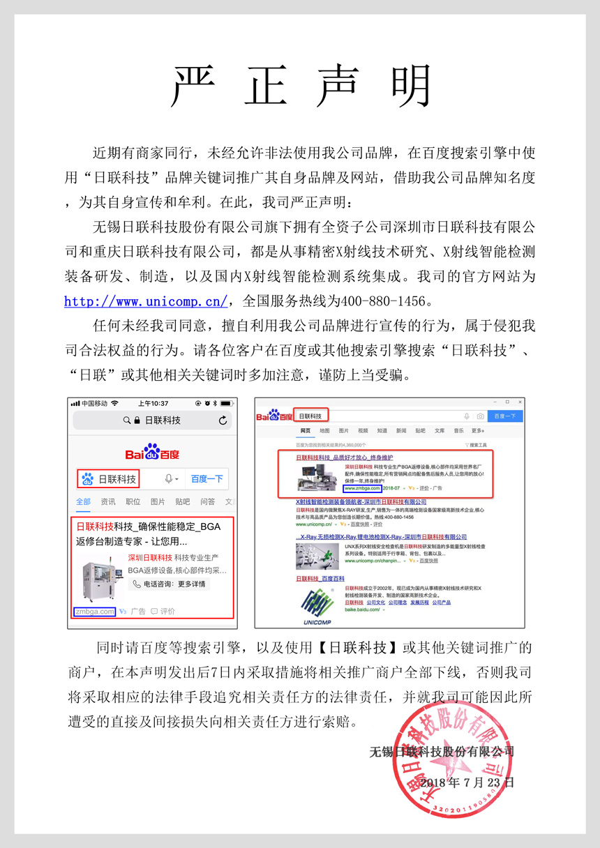近期有商家同行,未經(jīng)允許非法使用我公司品牌,在百度搜索引擎中使用“日聯(lián)科技”品牌關(guān)鍵詞推廣其自身品牌及網(wǎng)站,借助我公司品牌知名度,為其自身宣傳和牟利。在此,我司嚴正聲明: