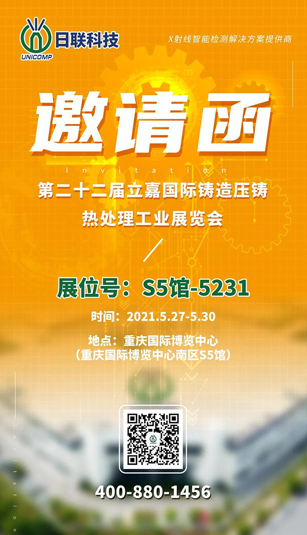 第 22 屆立嘉國際鑄造壓鑄熱處理工業展將于 2021年5月27至30日在重慶國際博覽中心舉行。日聯科技位于S5館5231展位,此次將展出UNC系列X射線智能檢測設備。